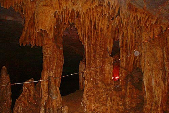 | 藏君洞為一大型天然溶洞,溶洞長25000米,已探明洞長4000m,洞內(nèi)洞中有洞、洞中有河,迂回曲折,地下河流水潺潺,溶洞分布在石炭系中、上統(tǒng)碳酸鹽巖中,洞內(nèi)鐘乳石十分豐富:石筍、石柱、石幔、石樓、石像比比皆是。洞內(nèi)構(gòu)造奇特,石鐘乳千姿百態(tài)、絢麗多彩,景觀奇秀,珍品奇絕,是我國少有的大型碳酸鹽巖巖溶洞穴之一。目前已開發(fā)的4000m洞穴中,由十二個大的溶洞群構(gòu)成,由洞口往里有護君堂、惠帝殿、兩重天、南巡廳、不夜城、龍鳳宮、北國廳、江南廳、江河壩、閱兵場、國寶廳等溶洞景觀區(qū)。溶洞一般高5~30m,長60~100m,寬10~20m,面積60~200㎡。十二個溶洞沿地下河呈串球狀分布,洞與洞之間有巷道(地下河管道)相連,溶洞中景觀十分豐富,仿佛是一個瑰麗的地下宮殿。如護君堂內(nèi)有“尚書帽”、“御馬”、“貓頭鷹”、“小羊羔”、“老夫妻”、“天宮浴盆”等景點,惠帝殿內(nèi)由“斷劍石”、“龍椅”、“觀音立佛”、“觀音蓮花寶座”等,“蔬果長廊”中有形似花菜、白菜、絲瓜、茄子、黃瓜等石筍,不夜城內(nèi)有乳白色石鐘乳巖溶坡面,龍鳳宮內(nèi)有石幔、石柱琳瑯滿目及鐘乳石構(gòu)成的似漢白玉“龍鳳石床”、“旭日東升”的浮雕石鐘乳墻、“燈籠群”、“攀龍柱”、“石蓮花”等,國寶廳巨型石柱等,巷道側(cè)壁唐僧師徒“西天取經(jīng)”壁畫等,景觀類型齊全,是巖溶洞穴中具有典型地學(xué)意義的巖溶地貌景觀,屬國家級的地質(zhì)遺跡景觀。