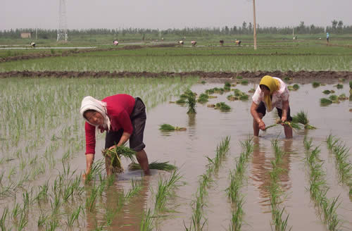 老者祝詞念誦完畢,大伙兒便捋起褲腿挽起衣袖忙乎開了,插秧開始,田里一片忙碌的景象。