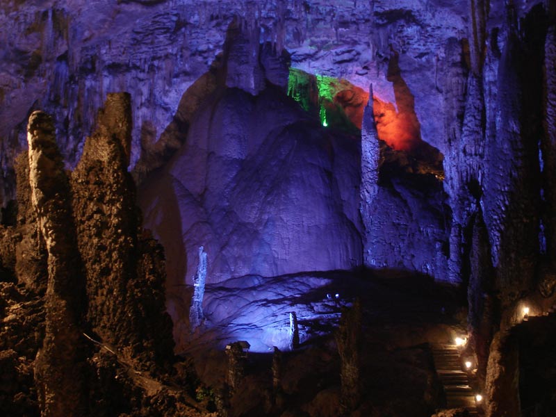 九天洞圖片 九天洞四絕: 第一絕:九天洞大 九天洞總面積250多萬平方米,折合4萬多畝。這樣一個大溶洞,比堪稱世界第一洞的利川溶洞還大3倍。據(jù)《環(huán)球天然奇觀》一書介紹,南斯拉夫的波斯托伊納大巖洞與美國的巴哈馬大藍(lán)洞,都稱為“世界上最大的洞”,還有古巴的貝拉雅馬爾大巖洞與我國貴州、湖北神農(nóng)架一些溶洞,也都被稱為“世界或中國最大的溶洞”?墒沁@些溶洞,同九天洞比較,都會感到遜色不少。1988年,中國科學(xué)地質(zhì)研究所巖溶與地下水研究室主任張壽越教授兩次來九天洞考察,他認(rèn)為該洞是亞洲第一大洞,于是他給九天洞題詞:“滴石鑄玄女,暗河鏤九天”。1988年9月下旬,來自美國、英國與比利時的15位洞穴專家對九天洞作深入研究,連續(xù)7天7夜住在洞內(nèi)全面考察。通過考察,他們一致認(rèn)為九天洞是世界奇跡,不僅具有很高的旅游價值,同時還有很高的科研價值。