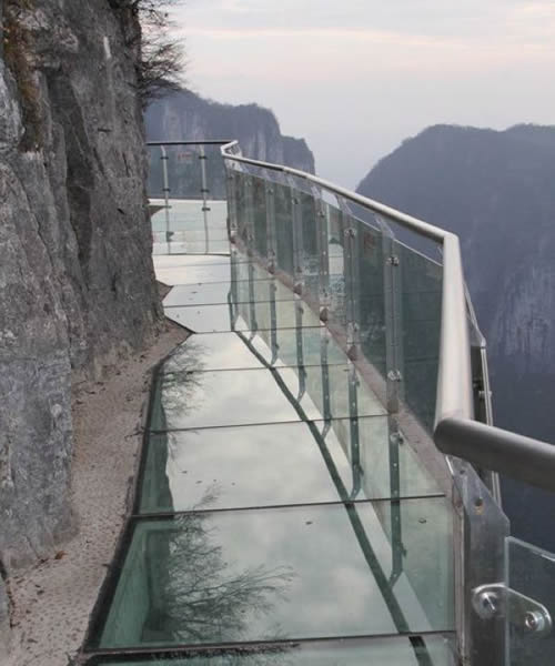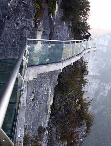 | 2011年10月1日,張家界天門山國家森林公園新建的玻璃棧道正式對游客開放。玻璃棧道懸于天門山頂西線,長60米,最高處海拔1430米。是張家界天門山景區(qū)繼懸于峭壁之上的鬼谷棧道、憑空伸出的玻璃眺望臺、從玻璃臺可以看見下面。玻璃臺伸出棧道有4-5米,專供游人拍照、橫跨峽谷的木質(zhì)吊橋后打造的又一試膽力作。為了讓游客零瑕疵的透過玻璃橋看到美麗的風(fēng)景,上橋的游客均要求戴上鞋套,以保持玻璃橋的透明和干凈。玻璃棧道的刺激震撼,可與舉世聞名的美國大峽谷玻璃走廊“天空之路”媲美,因而有了東方“天空之路”的美譽。
