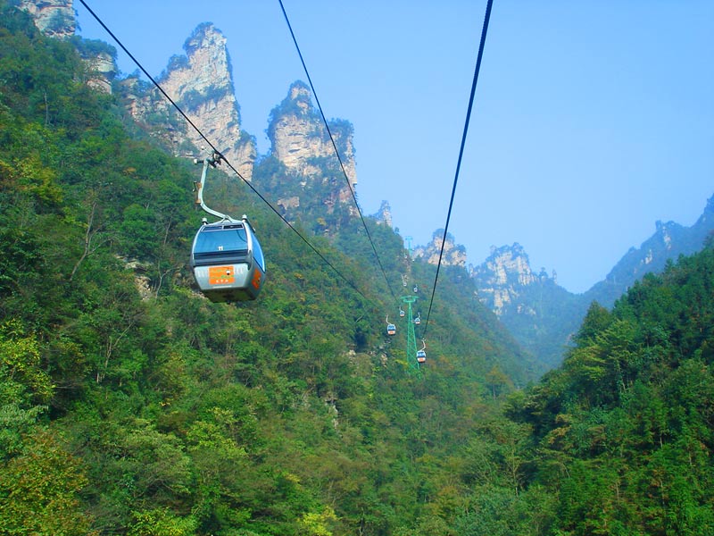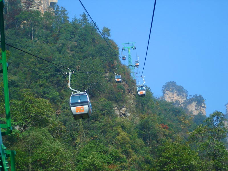 天子山索道 天子山索道的建成開通,極大地改善了武陵源風(fēng)景區(qū)的旅游交通環(huán)境,使游人花半日功夫上得天子山來只看一眼的遺憾,變成了間歇飛渡上山便可盡覽天子山這“擴(kuò)大的盆景,縮小的仙境”的迷人景色之享受。乘坐天子山索道,既舒適又安全,沿線風(fēng)光奇絕,奇松怪石,莽莽翠林,幽幽泉水,嬉戲獼猴,盡收眼底,令人嘆為觀止。尤其在云霧繚繞之時,游客乘坐索道更能體驗(yàn)到神仙飄逸飛行的動感與刺激。