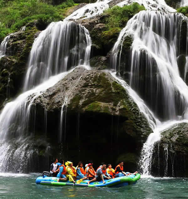 茅巖河漂流 茅巖河沿途的眾多飛瀑流泉中,尤以水洞瀑布最為壯觀迷人。瀑布從70多米高的峭壁瀉出,漫流過三級(jí)凸凹不平的峭壁,形成長(zhǎng)短不一的三疊,瀑水在每級(jí)的石臺(tái)上漫過突兀出來的溝溝槽槽飛流而下,或?qū)捜玢y河,或窄似白練,或似垂掛的水簾,或似串串銀珠,飛落茅巖河中,撞擊得河水顫顫悠悠,鱗光閃閃。