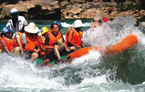 河水更為兇悍強(qiáng)勁,昂頭撤蹄,湍湍東去。一灘連一灘,一浪挽一浪。百里河流百里灘,百里流水百里浪。茅巖河水無情地撞擊著河中根基深厚的礁石,盡管撞擊得頭破血流,斷腸裂肺,粉身碎骨,依然無怨無悔,從不停歇地演繹著生命的壯觀。被撕碎的生命化成點(diǎn)點(diǎn)銀珠拋上天空,繼而又落回永不消逝的軀體上,織就了一幅生生不息的王母娘娘灑降甘露圖。而被河水沖撞了千百年仍然傲然屹立的礁石,撕破了河水剛剛要向人展示玉脂般的肌膚,又被洶涌而至的河水淹沒,再次擊起滿天銀花。前進(jìn)與阻擋相搏發(fā)生的巨大轟鳴,在河谷里一次又一次的回響,在群山中一次又一次地震蕩。若乘坐皮筏或小舟在河上漂流,一種無以言狀的享受游走在每根神經(jīng)。人時(shí)而被軟若無骨的河水拋上浪尖,時(shí)而又被它牽扯著跌入峰谷。會(huì)不由自主地發(fā)出享受大自然賦予的刺激的無險(xiǎn)驚叫。尖叫聲與浪濤聲匯成了一支歡樂的樂章。