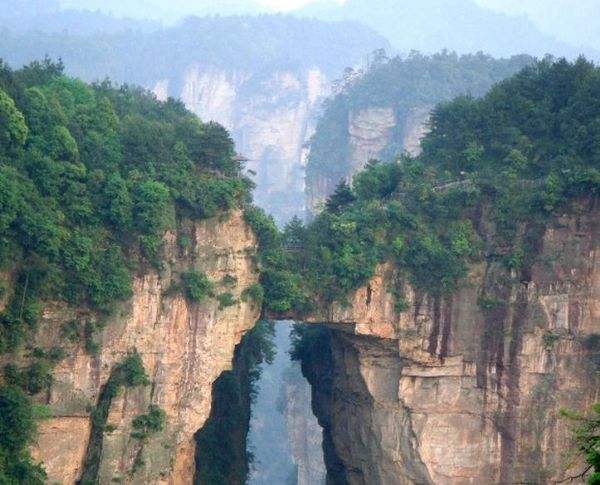 “后花園”至天下第一橋,有一條全長(zhǎng)2000多米的游道,路面多為白色的條石鋪成,站在遠(yuǎn)處觀望,很像一條白色的綢帶打了兩個(gè)結(jié),一頭系在“迷魂臺(tái)”,一頭第在“天下第一橋”。信步漫游,沿途可欣賞到“拜仙臺(tái)”、“百丈絕壁”、“小洞天”、“情人谷”等別有情趣的景點(diǎn),這里海拔不高,一般不受氣候影響,慢慢品味,定會(huì)使您賞心悅目!疤煜碌谝粯颉笔菑埣医纭笆蠼^景”之一。也是袁家界的標(biāo)志性景點(diǎn),它是居于兩山之間形成的一座天然石橋,而兩山原為一體,橋身是兩山相連的關(guān)鍵部分,但因中間石質(zhì)較為薄弱,由于風(fēng)化、崩塌作用的影響,又經(jīng)過(guò)日曬雨淋、流水洗刷、山洪沖擊,久而久之,終于形成今天這一特別的奇景……。自杉刀溝上袁家界,沿絕壁頂部邊緣遨游,至于中坪“觀橋臺(tái)” 遙望千米之外,只見(jiàn)一天然石橋凌空飛架兩峰之巔,氣勢(shì)磅礴,奇?zhèn)ソ^倫,被稱為“天下第一橋”。石橋?qū)拑H3米,厚5米,跨度約50米,相對(duì)高度近400米。天下第一橋與夫妻巖并稱“張家界雙絕”!疤煜碌谝粯颉睒蛎鎸拑擅祝袼拿,跨度為二十多米,高度為三百多米,是世界是迄今為止所發(fā)現(xiàn)落差最高的天然石橋。
