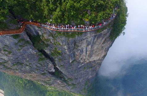 站在棧道上俯瞰群山,古人“會(huì)當(dāng)凌絕頂,一覽眾山小”的感覺(jué)油然而生。由于天門山是國(guó)家森林公園,植被特別豐富,加上典型的喀斯特地貌,所以,在這條棧道上更能找到一種在乘坐直升飛機(jī)飛越熱帶雨林大峽谷的感覺(jué),這平時(shí)只能在電影里看到的場(chǎng)景,在這里能讓你身臨其境。