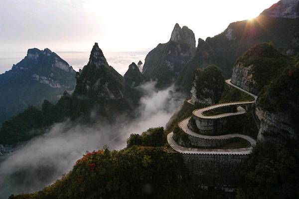 天門洞以其接地通天的態(tài)勢(shì),成為人們心中通天的門戶,而通往天門洞的盤山公路也因此被稱為“通天大道”。更為神奇的是,在公路竣工的時(shí)候,人們驚奇地發(fā)現(xiàn),這條順山勢(shì)修建的通天大道剛好99個(gè)彎,暗合了“天有九重,云有九霄”之意。 通天大道以進(jìn)山時(shí)的標(biāo)志門為起點(diǎn),一直通達(dá)天門洞腳下,全長(zhǎng) 10.77 千米,但就在這么短的距離里,它的海拔卻從 200 米 急劇提升到了 1300 米,大道兩側(cè)絕壁千仞,空谷幽深,180 度的急彎此消而彼,層層疊起,“ 堪稱天下第一公路奇觀 ”。中國(guó)書法協(xié)會(huì)常務(wù)副會(huì)長(zhǎng)沈鵬先生走過(guò)通天大道后欣然為其題字“曲道通天”,字體遒勁挺拔,與通天大道的奇絕天下相融為一體。通天大道于 1998 年開(kāi)始修建,因天門山獨(dú)特的地質(zhì)和氣候所局限,至 2005年全面貫通,歷時(shí)8年,共耗資 1 億元人民幣。整個(gè)工程充滿著艱辛卓絕,它凝聚著全體施工人員的智慧和心血,其勢(shì)驚險(xiǎn)奇絕,蕩氣回腸,以蜿蜒迂回穿行于山體絕壁之天險(xiǎn)而成為天下第一公路奇觀。